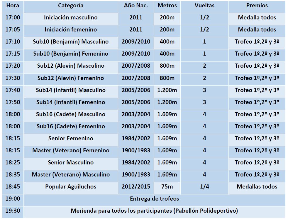 - Trofeos: los tres primeros clasificados en cada categoría y prueba, un premio para el primer atleta local y medalla para el resto de participantes en las categorías escolares. En la categoría aguiluchos no habrá clasificación.